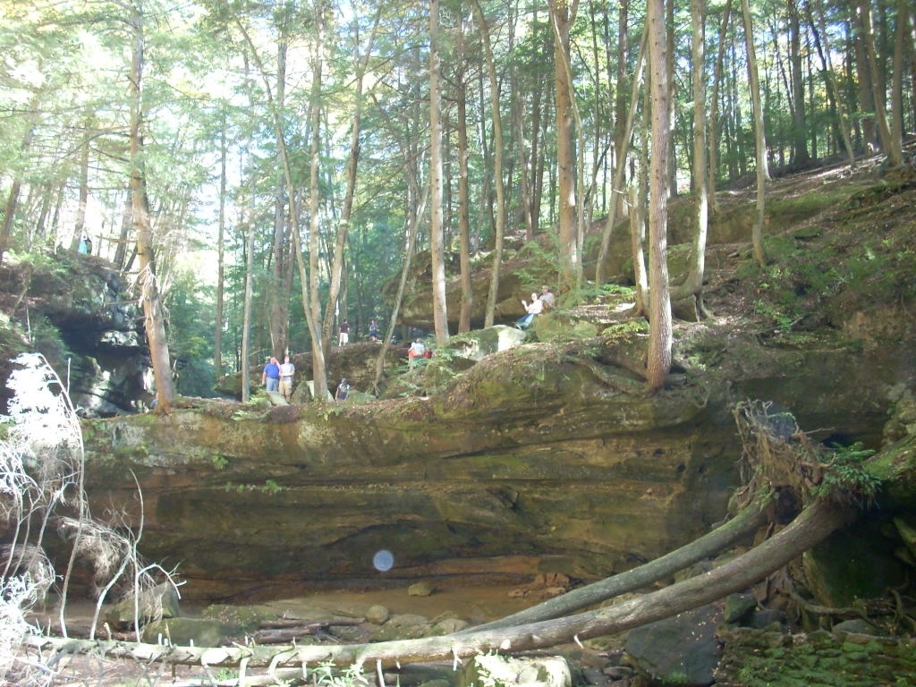 My Cousin Becky was vacationing in the Hocking Hills this past summer. While spending the weekend she and her family members had a strange feeling that someone or something was with them. Becky had sent me several odd photo’s; I have only posted this picture while protecting her privacy. If you look at the photo you can see a strange light abnormality in the cave. More interesting if you look up on the hill to the left, you can clearly see two apparitions standing next to each other. You can actually see right through one of them.