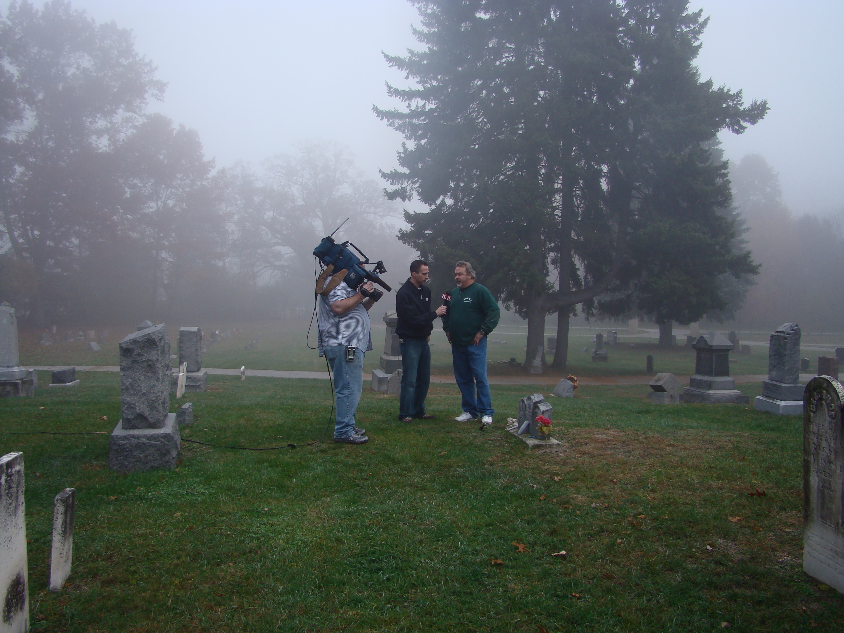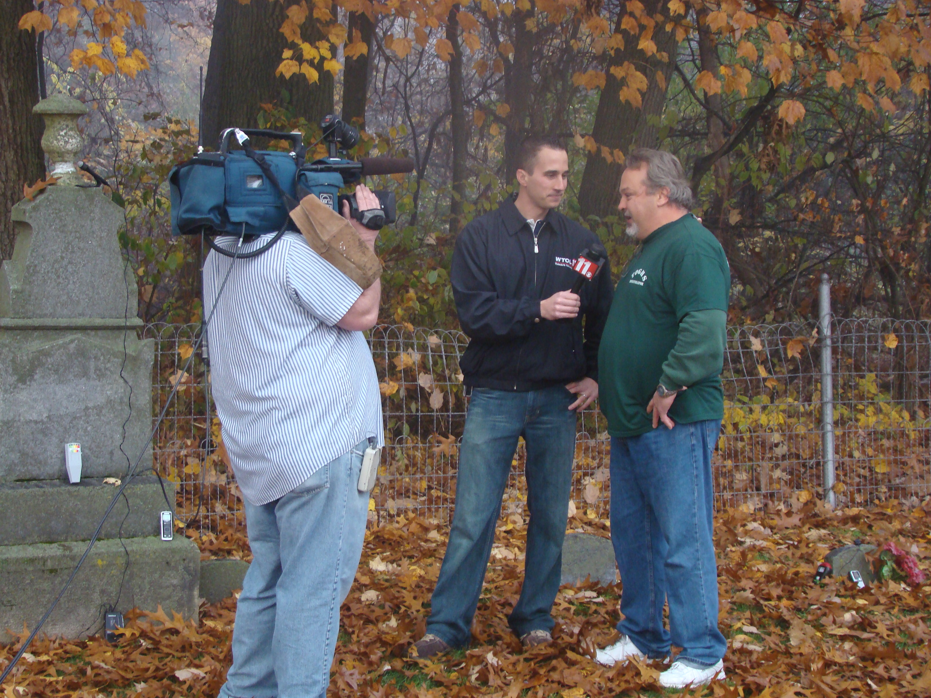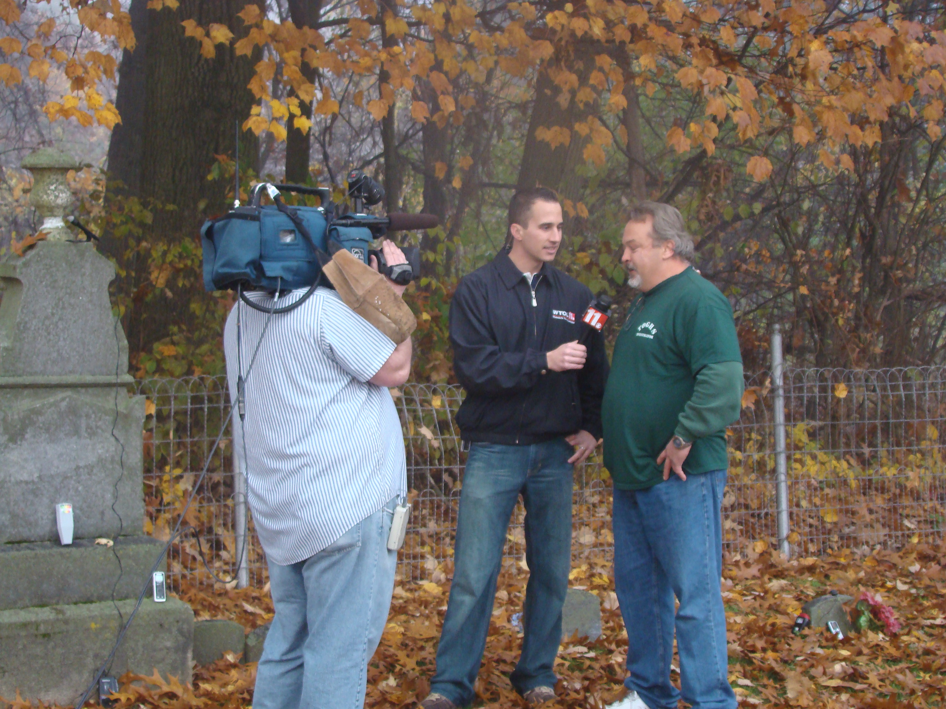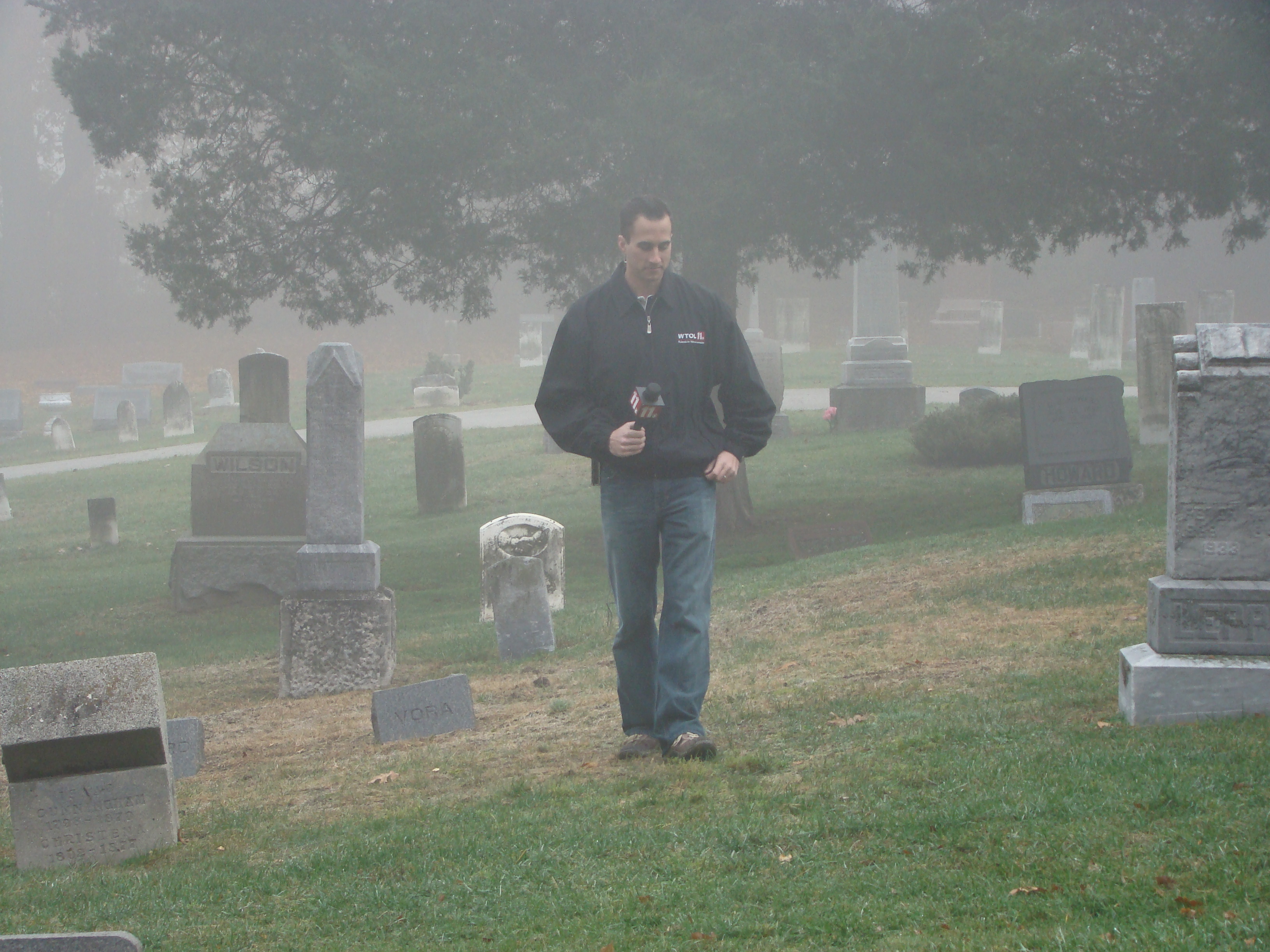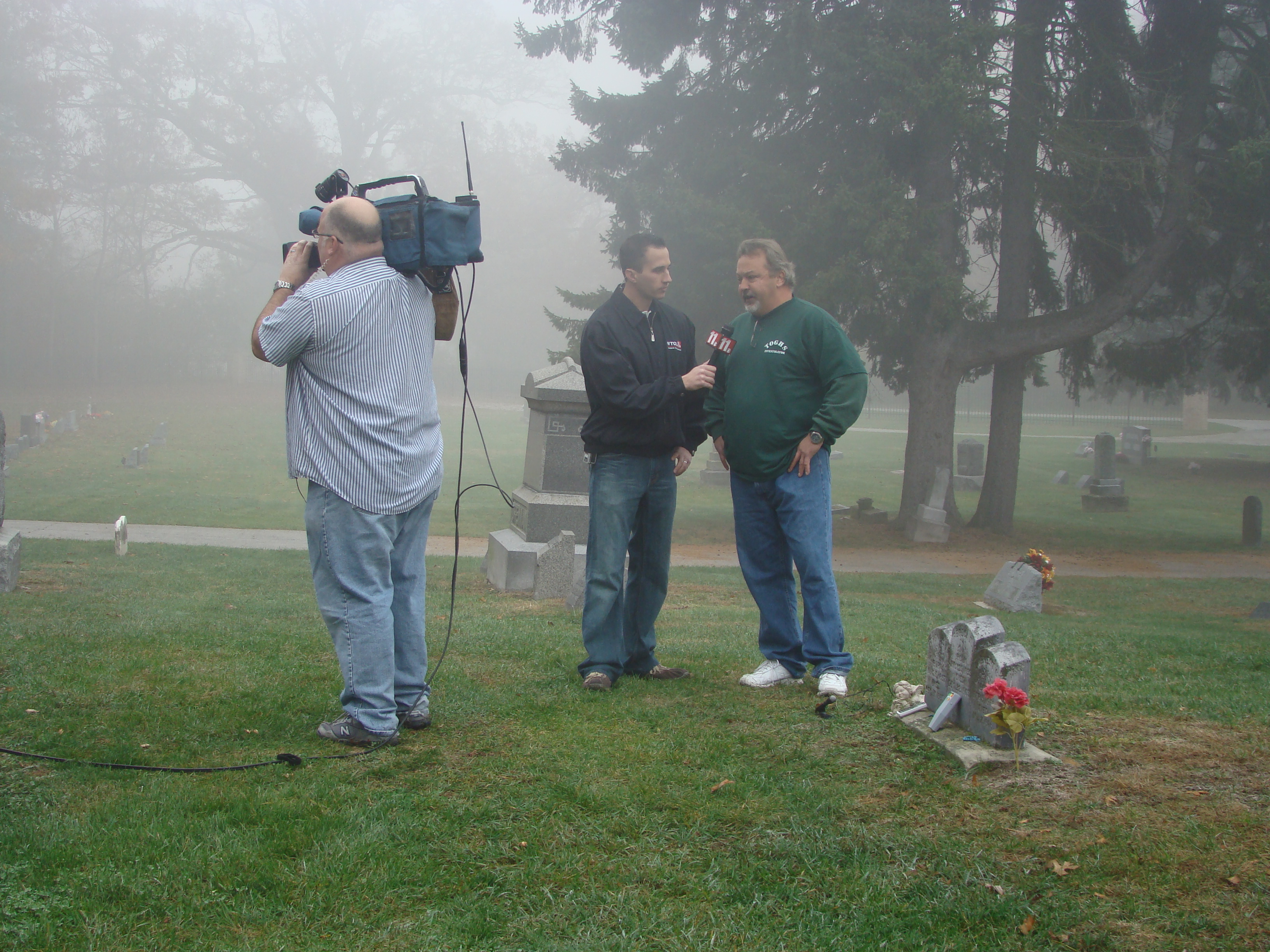 On Wednesday morning we went on the air live at 9:00am from the Lady in the Attic home on Toledo’s Eastside.  Mike, John, Becky and I arrived early at 8:00am to set up equipment. Once on the air, I was interviewed by Chris Vickers while the team worked an EVP session from the Attic, We did not capture anything paranormal but had fun working with WTOL 11 news. After the live broadcast we received tons of emails and blogs to our web site as well as requests for investigations. We kind of knew doing this Halloween telecast would bring out opinions and personal beliefs from our local audience. We agreed to set up another live show for the following morning.  Mike and I met Chris Vickers at one of our favorite legendary Haunted cemeteries, Wolfinger. The morning was very foggy and seemed perfect for an investigation and broadcast. We set up our equipment at two locations within the cemetery, the first set of headstones belonged to the three children that had died within a week of each other in the late 1800’s. Thomas, Rebecca and Ernest have been known to run along the fence line and throughout the cemetery, now they were being video taped and recorded during the entire broadcast as well as our longtime friend Eliza Ford, You might remember her name from one of my earlier investigations to this legendary haunted hot spot.  We shared air time between both locations but neither Eliza nor the children felt like being seen live on television during the broadcast.  I’ve included several pictures from Wolfinger cemetery that were taken during the broadcast. TOGHS would like to thank Rebecca Gilles, Chris Vickers and the entire staff at WTOL Toledo 11 news.