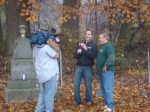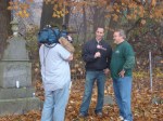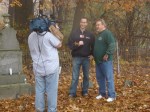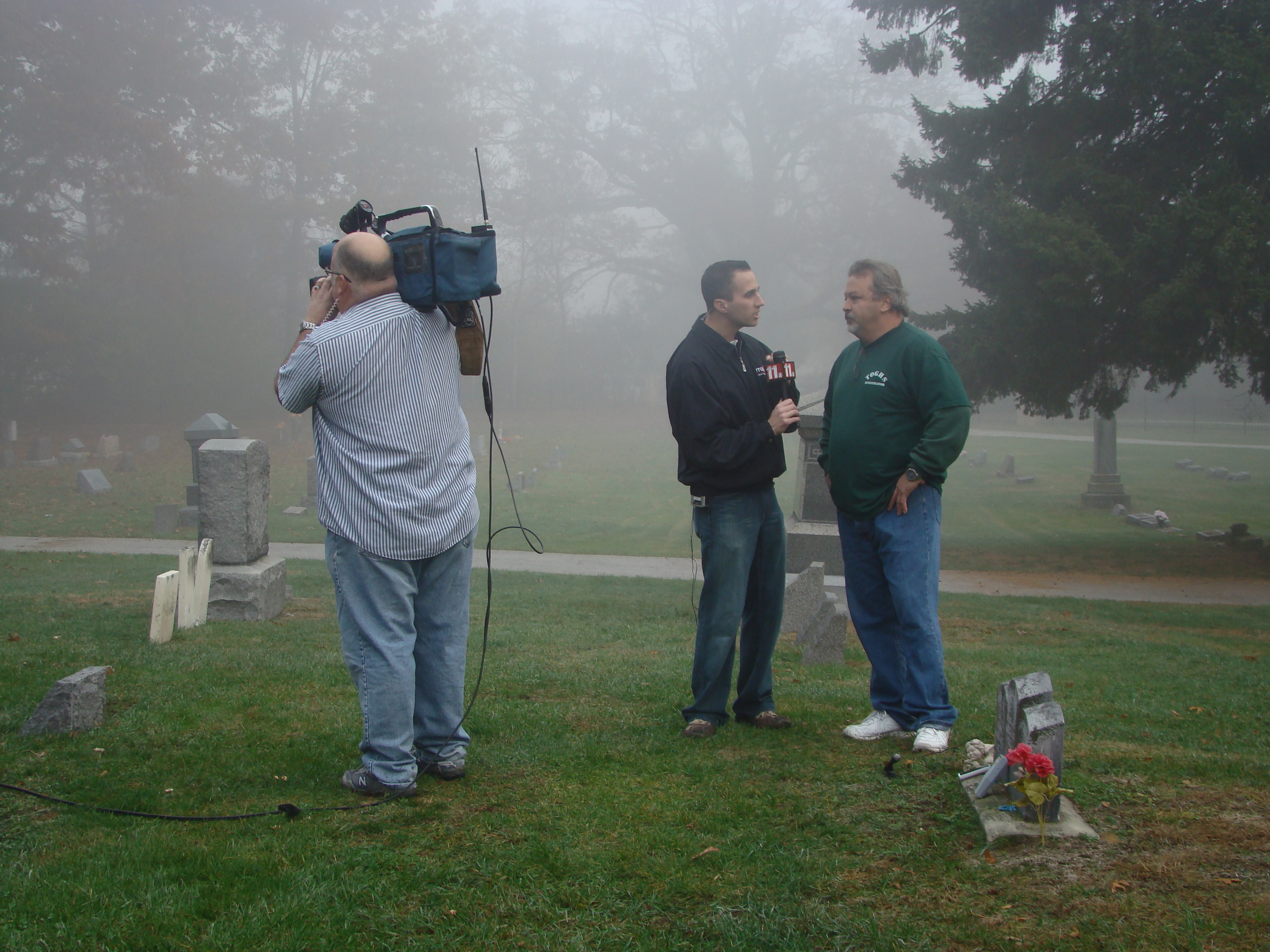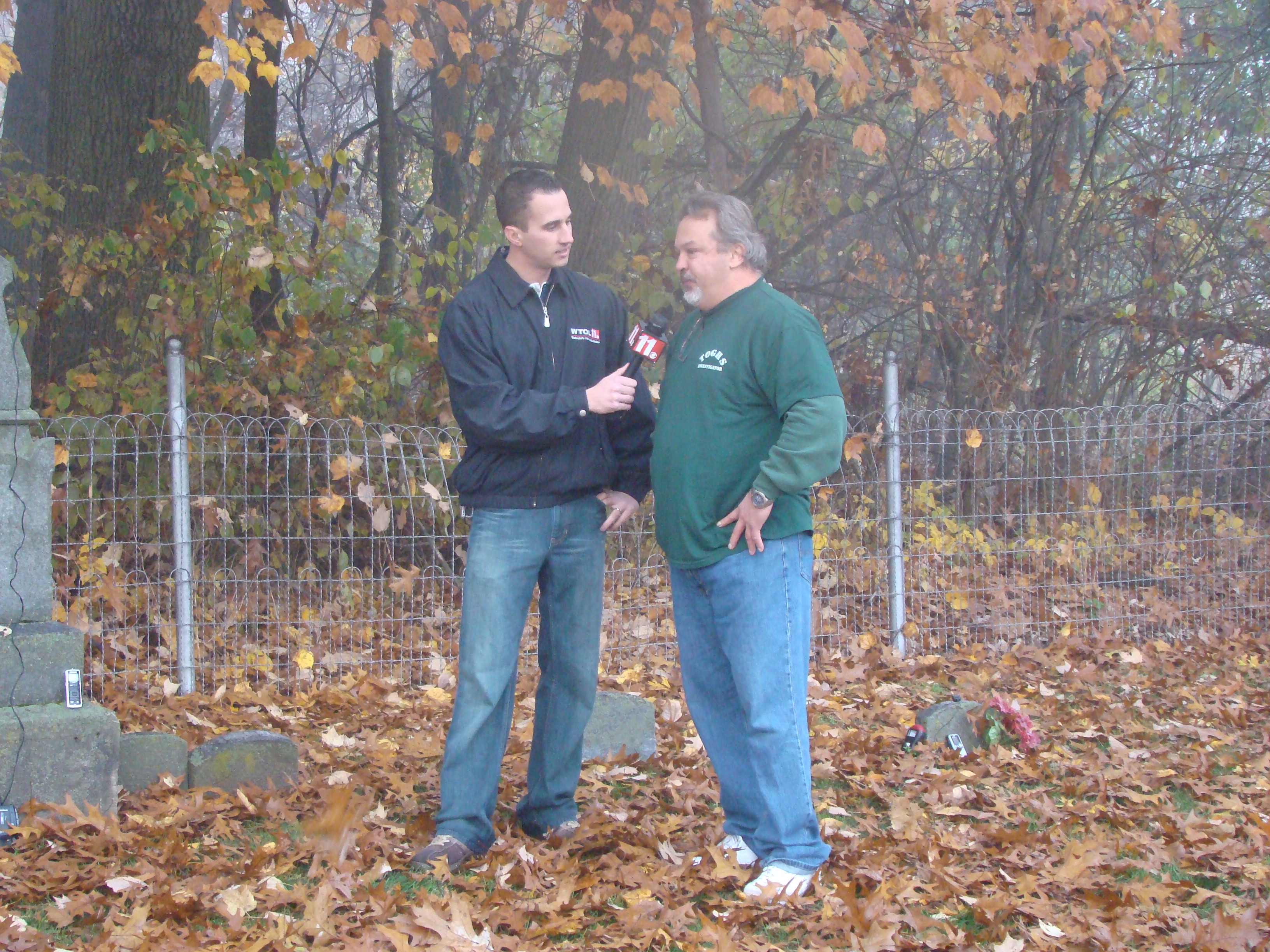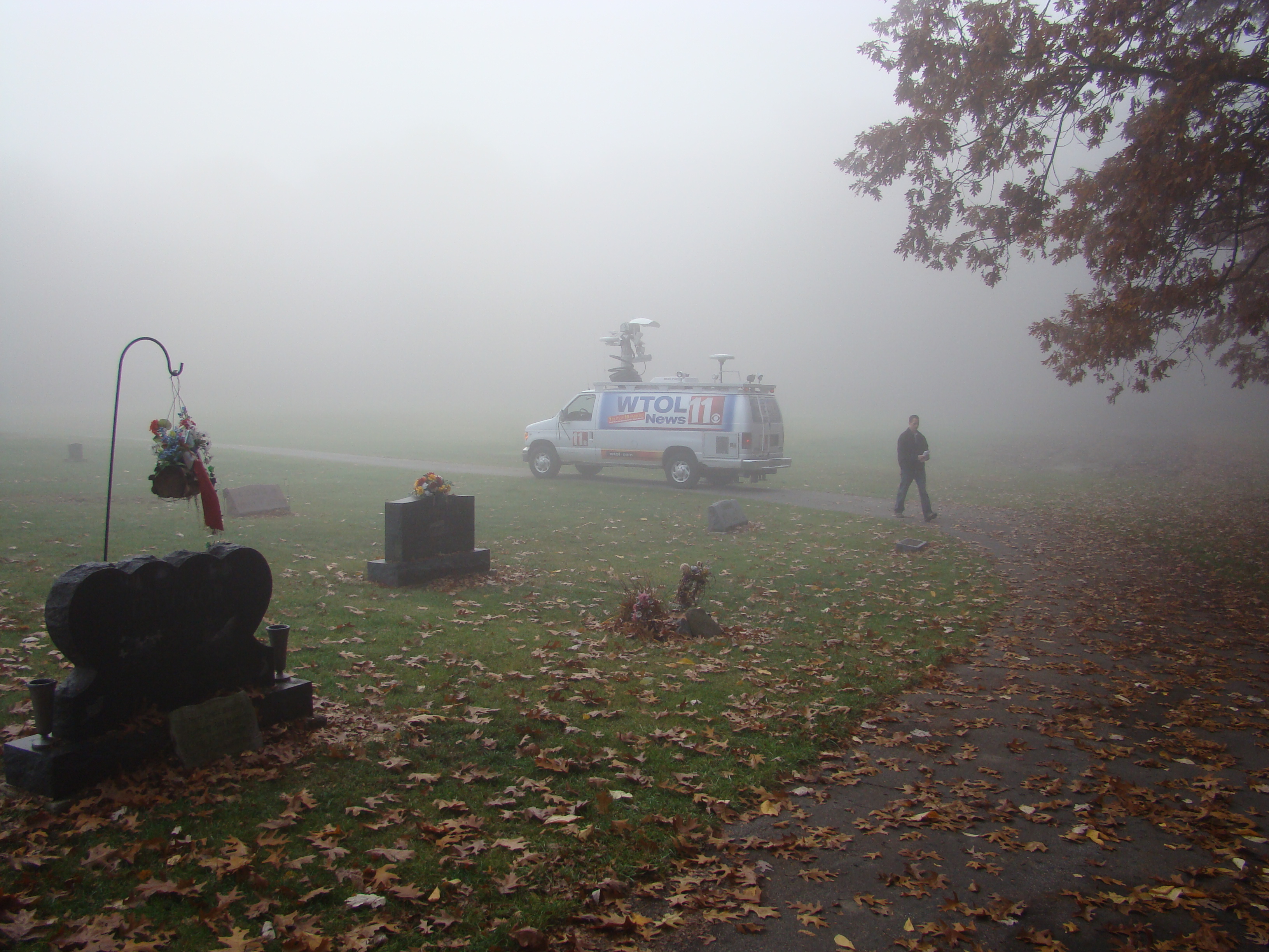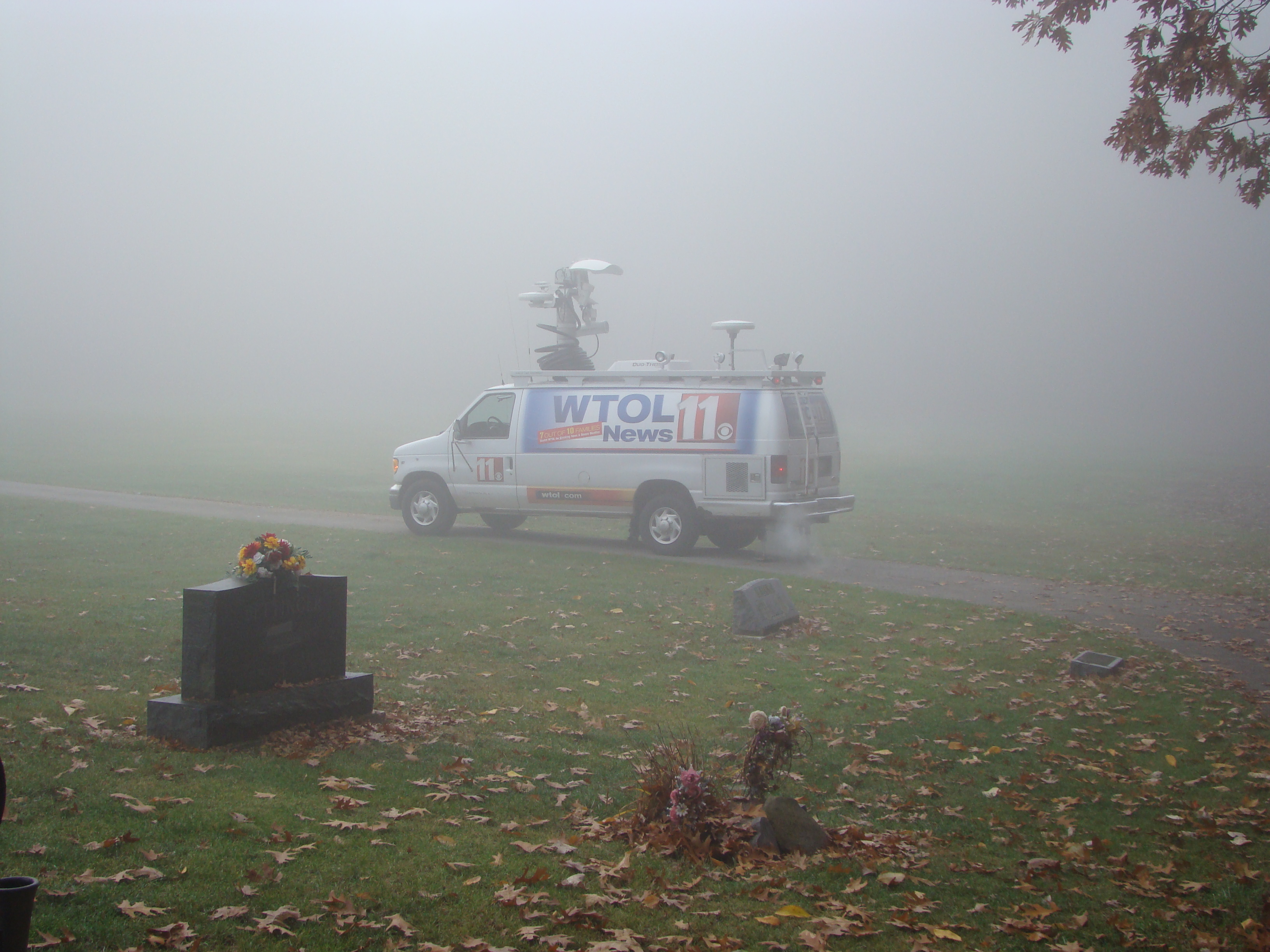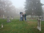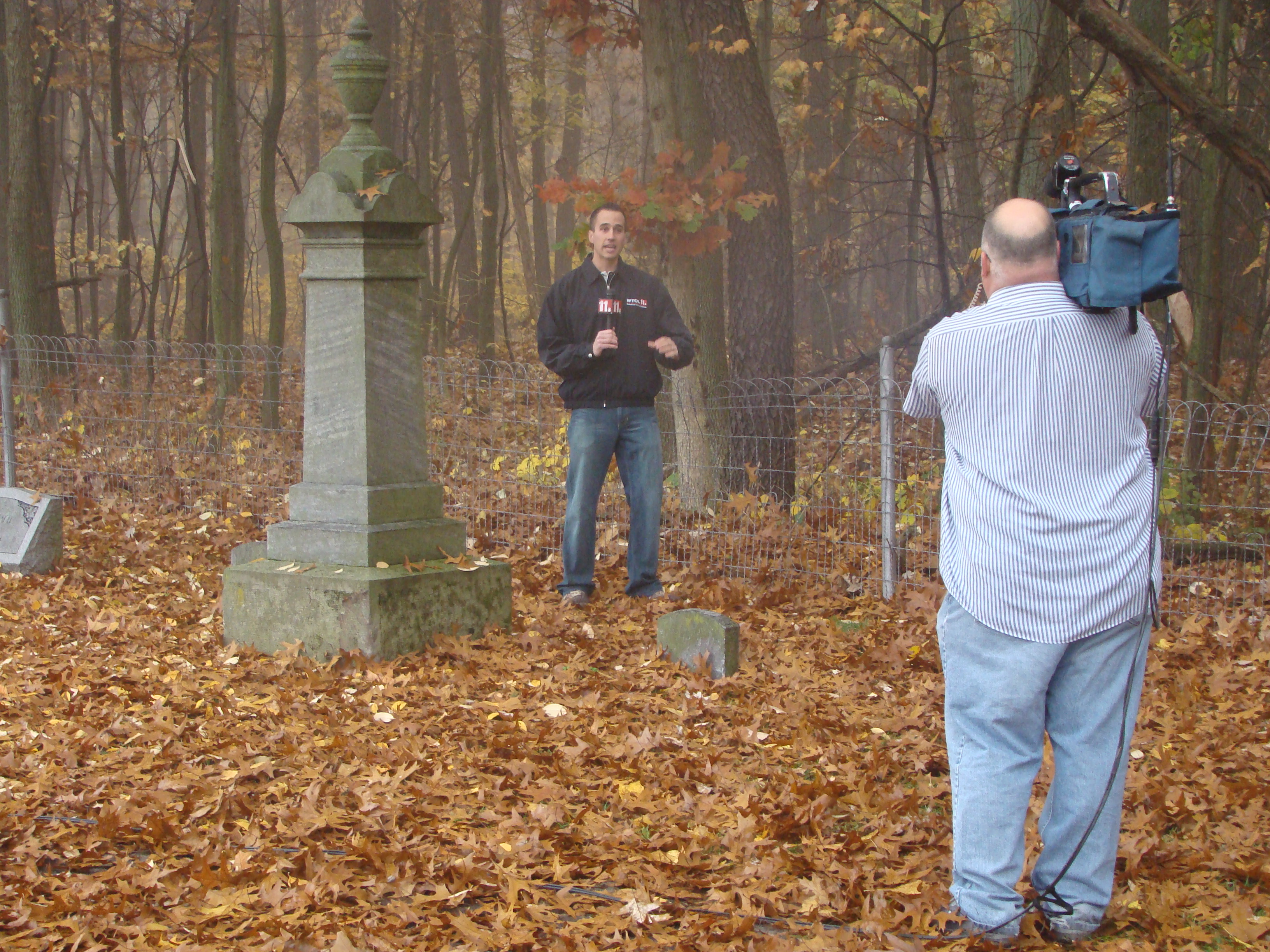 On Wednesday morning we went on the air live at 9:00am from the Lady in the Attic home on Toledo’s Eastside.  Mike, John, Becky and I arrived early at 8:00am to set up equipment. Once on the air, I was interviewed by Chris Vickers while the team worked an EVP session from the Attic, We did not capture anything paranormal but had fun working with WTOL 11 news. After the live broadcast we received tons of emails and blogs to our web site as well as requests for investigations. We kind of knew doing this Halloween telecast would bring out opinions and personal beliefs from our local audience. We agreed to set up another live show for the following morning.  Mike and I met Chris Vickers at one of our favorite legendary Haunted cemeteries, Wolfinger. The morning was very foggy and seemed perfect for an investigation and broadcast. We set up our equipment at two locations within the cemetery, the first set of headstones belonged to the three children that had died within a week of each other in the late 1800’s. Thomas, Rebecca and Ernest have been known to run along the fence line and throughout the cemetery, now they were being video taped and recorded during the entire broadcast as well as our longtime friend Eliza Ford, You might remember her name from one of my earlier investigations to this legendary haunted hot spot.  We shared air time between both locations but neither Eliza nor the children felt like being seen live on television during the broadcast.  I’ve included several pictures from Wolfinger cemetery that were taken during the broadcast. TOGHS would like to thank Rebecca Gilles, Chris Vickers and the entire staff at WTOL Toledo 11 news.