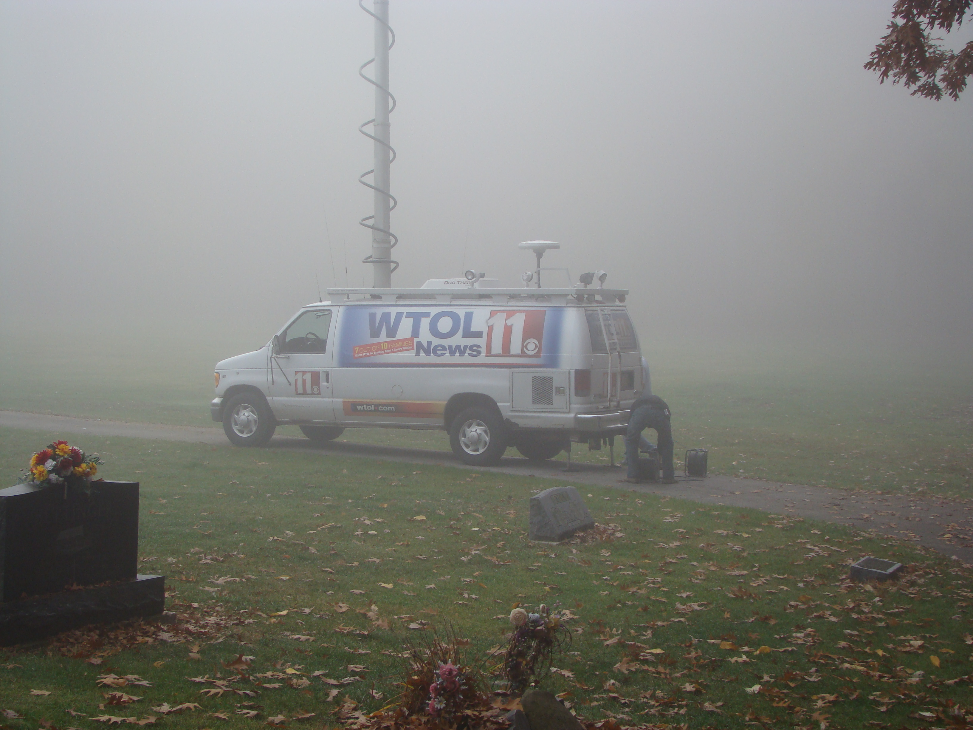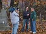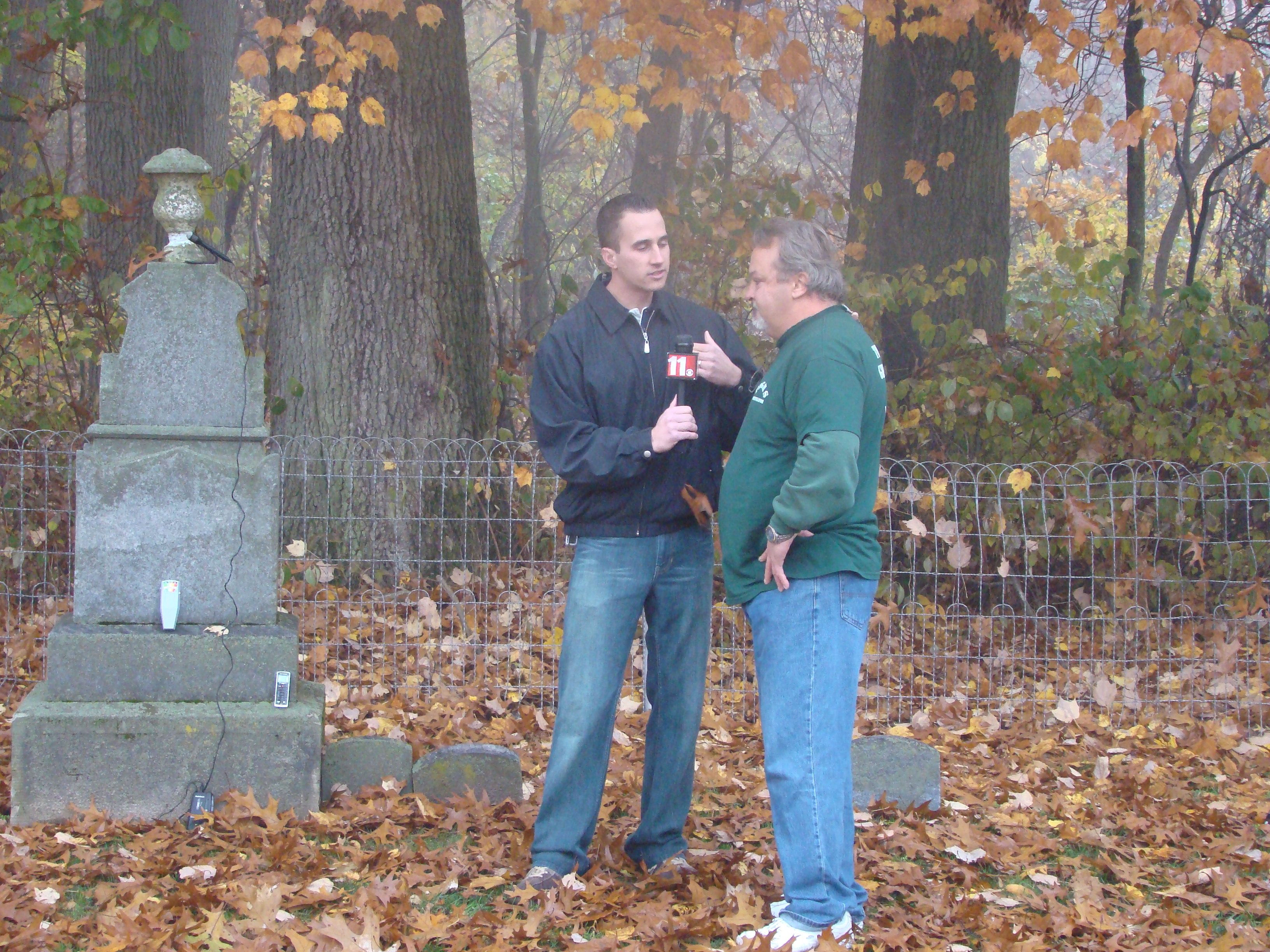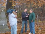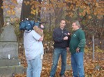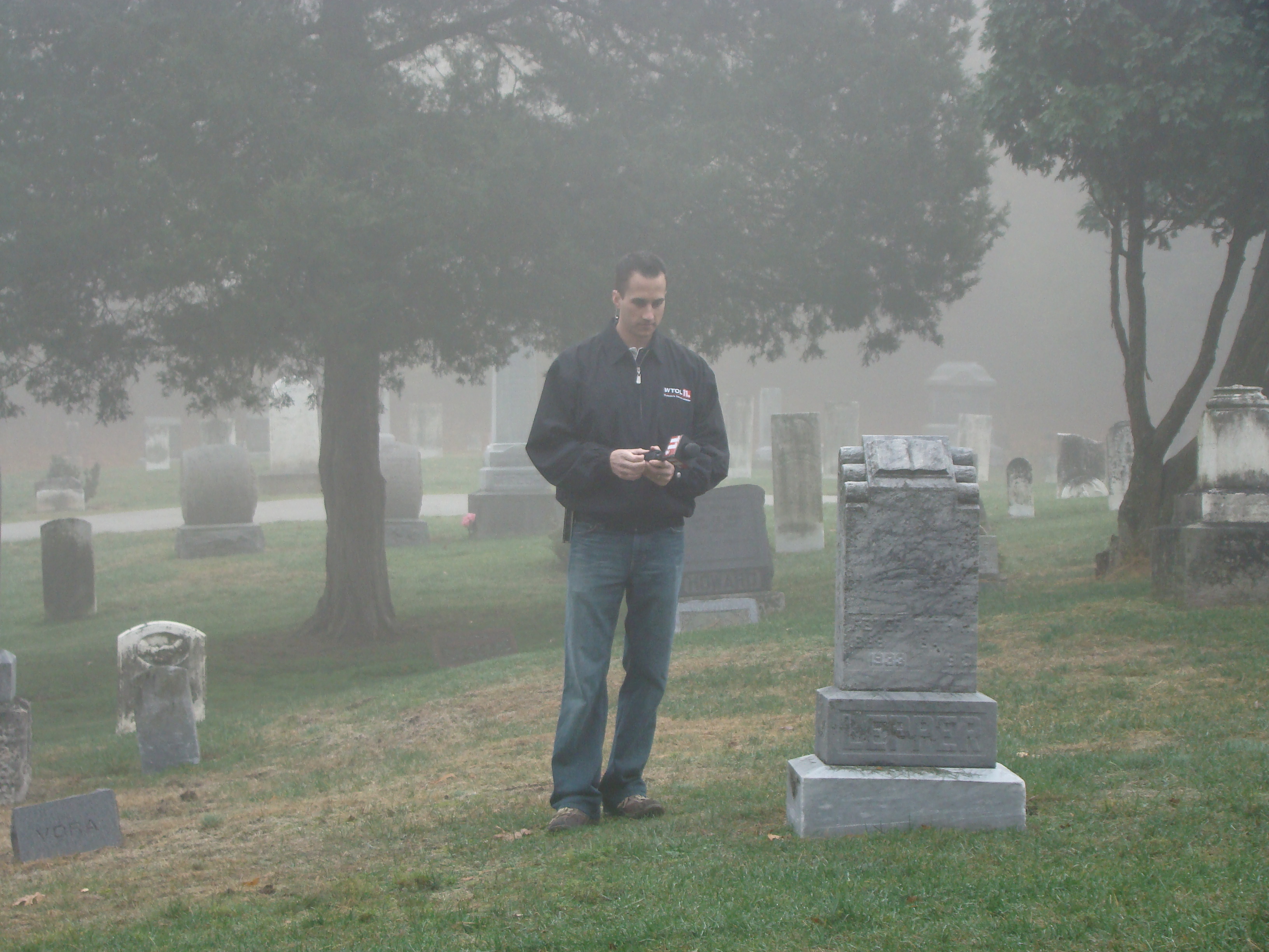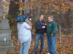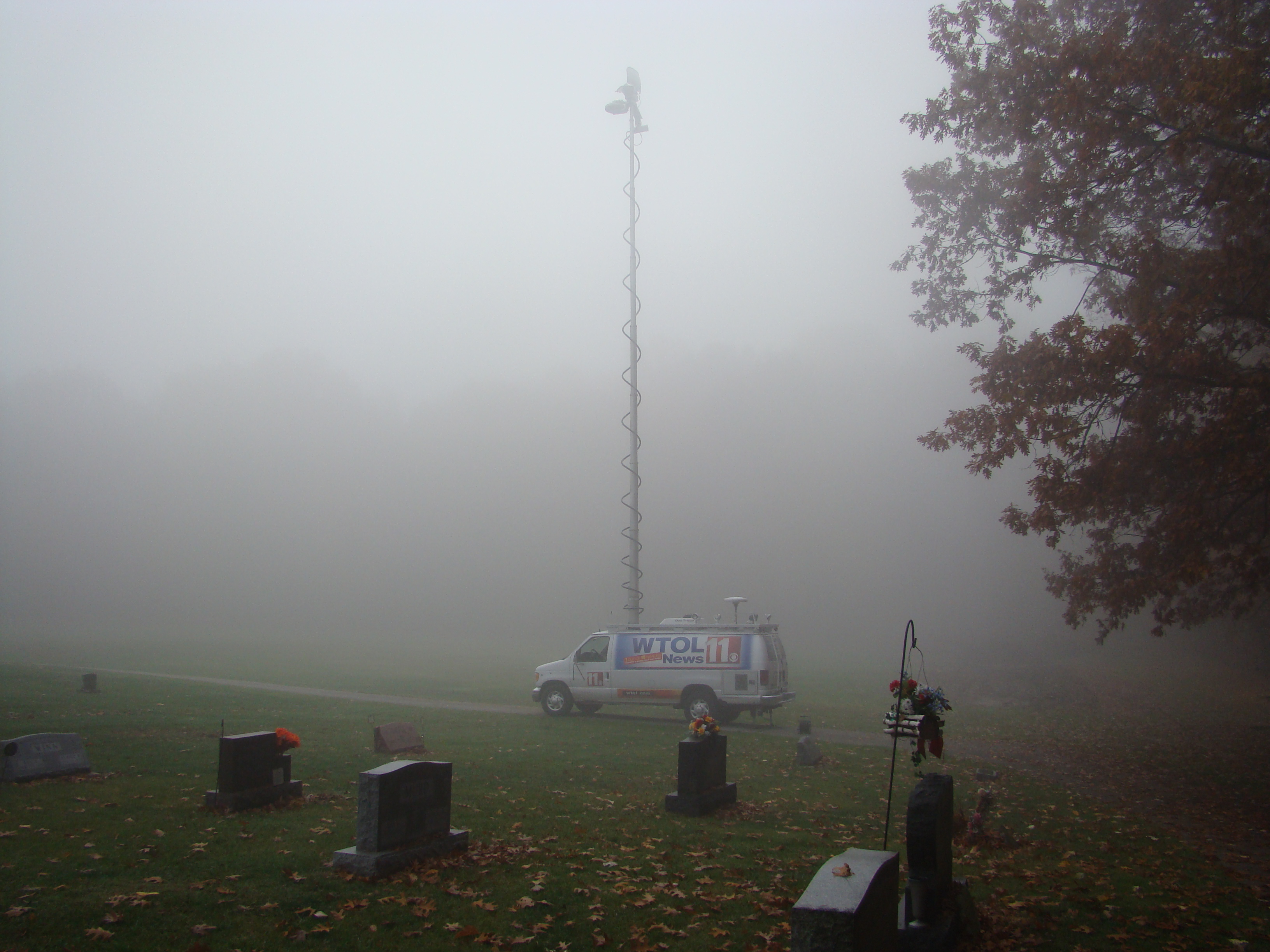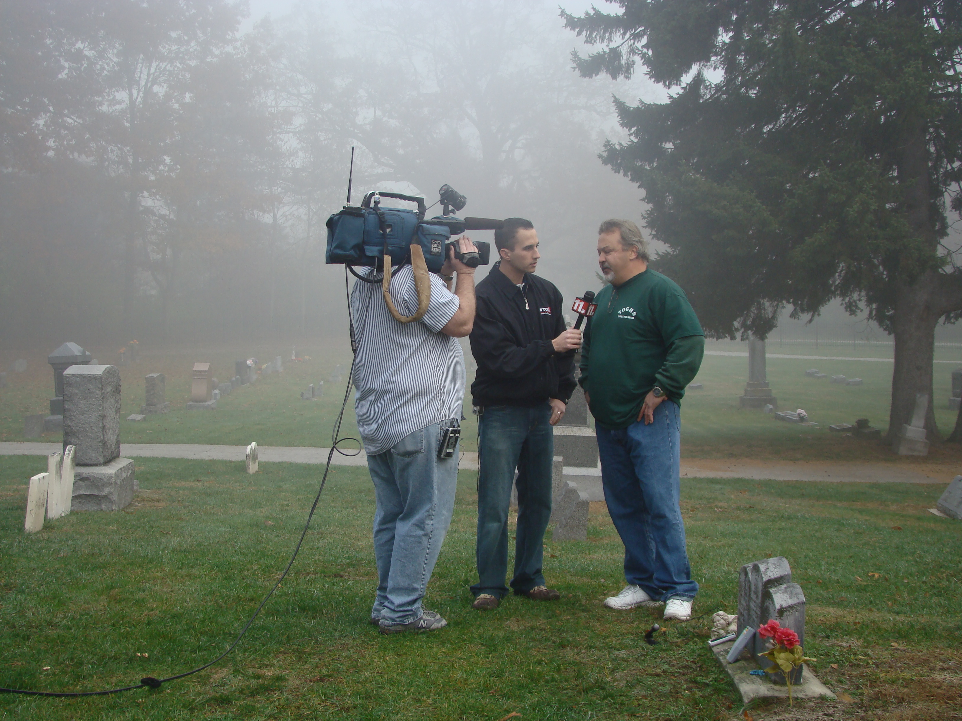 On Wednesday morning we went on the air live at 9:00am from the Lady in the Attic home on Toledo’s Eastside.  Mike, John, Becky and I arrived early at 8:00am to set up equipment. Once on the air, I was interviewed by Chris Vickers while the team worked an EVP session from the Attic, We did not capture anything paranormal but had fun working with WTOL 11 news. After the live broadcast we received tons of emails and blogs to our web site as well as requests for investigations. We kind of knew doing this Halloween telecast would bring out opinions and personal beliefs from our local audience. We agreed to set up another live show for the following morning.  Mike and I met Chris Vickers at one of our favorite legendary Haunted cemeteries, Wolfinger. The morning was very foggy and seemed perfect for an investigation and broadcast. We set up our equipment at two locations within the cemetery, the first set of headstones belonged to the three children that had died within a week of each other in the late 1800’s. Thomas, Rebecca and Ernest have been known to run along the fence line and throughout the cemetery, now they were being video taped and recorded during the entire broadcast as well as our longtime friend Eliza Ford, You might remember her name from one of my earlier investigations to this legendary haunted hot spot.  We shared air time between both locations but neither Eliza nor the children felt like being seen live on television during the broadcast.  I’ve included several pictures from Wolfinger cemetery that were taken during the broadcast. TOGHS would like to thank Rebecca Gilles, Chris Vickers and the entire staff at WTOL Toledo 11 news.