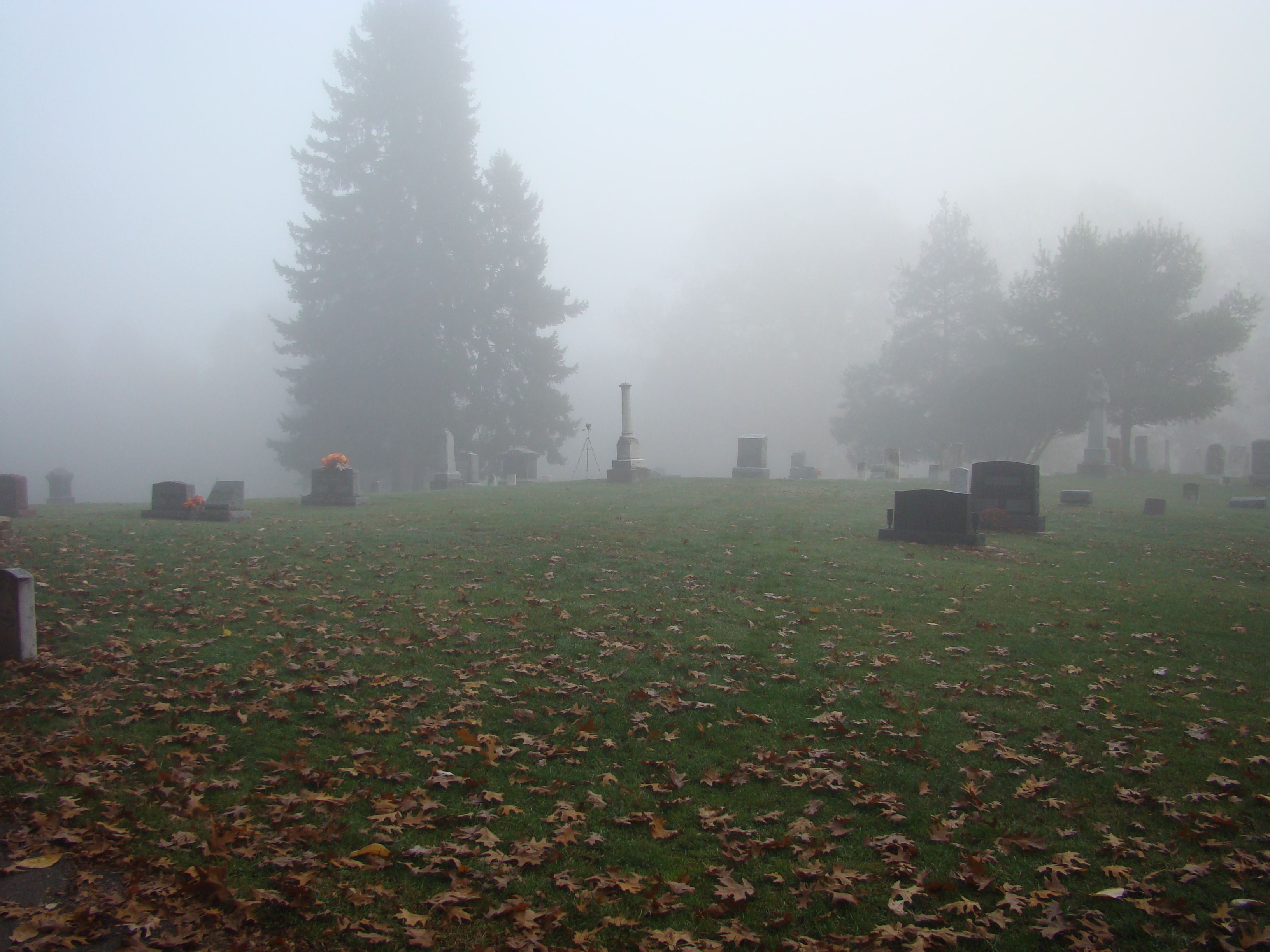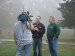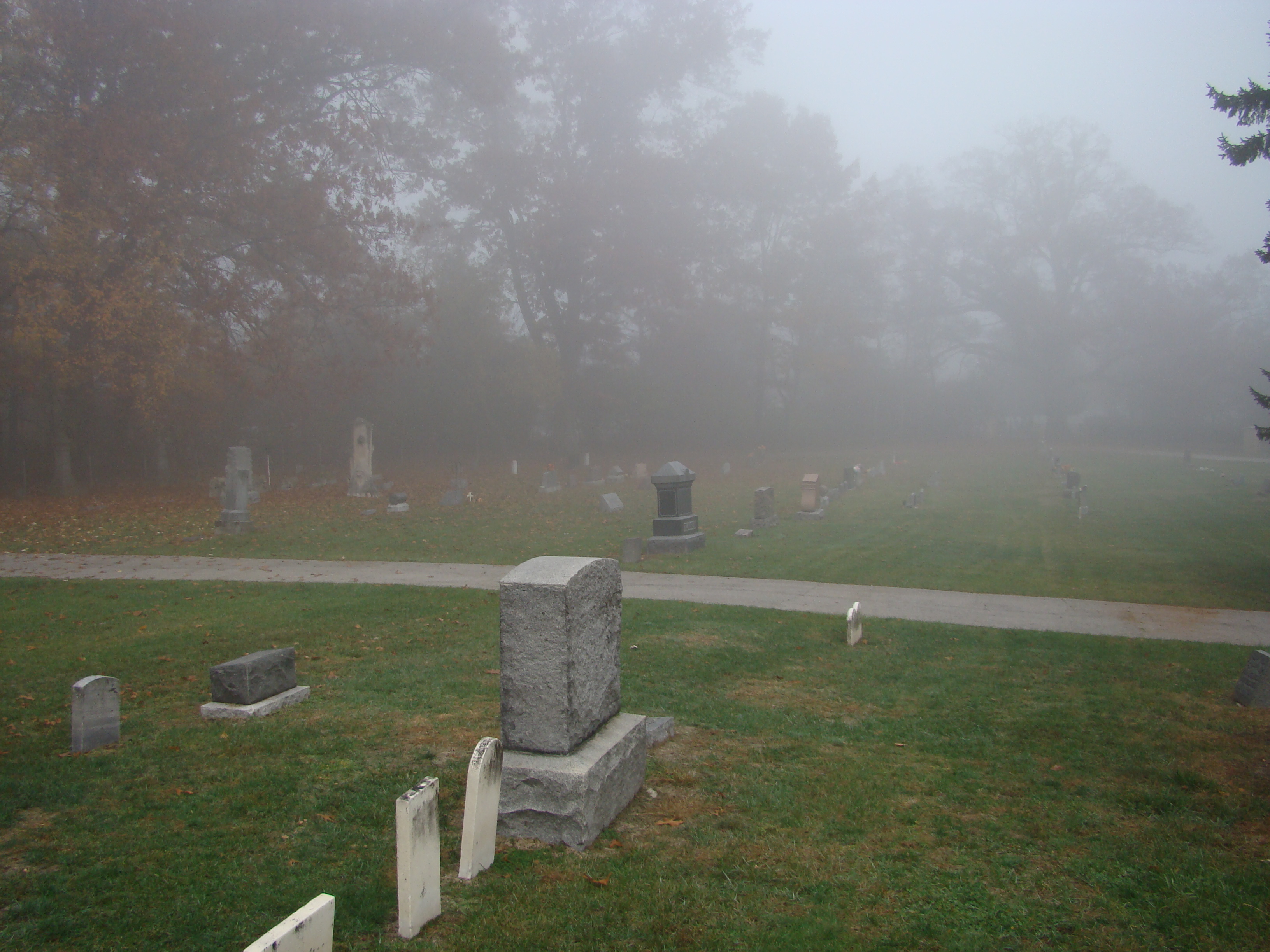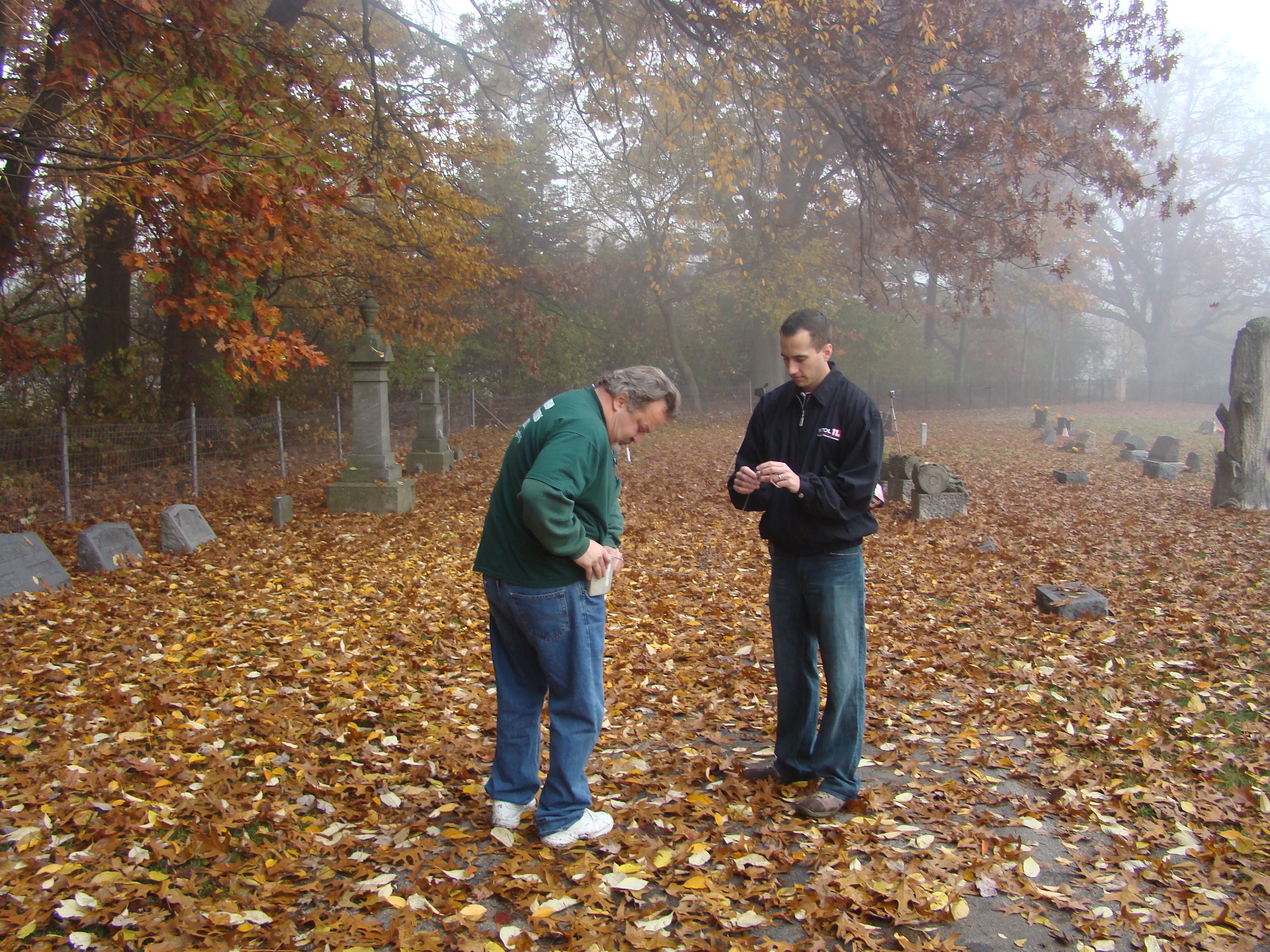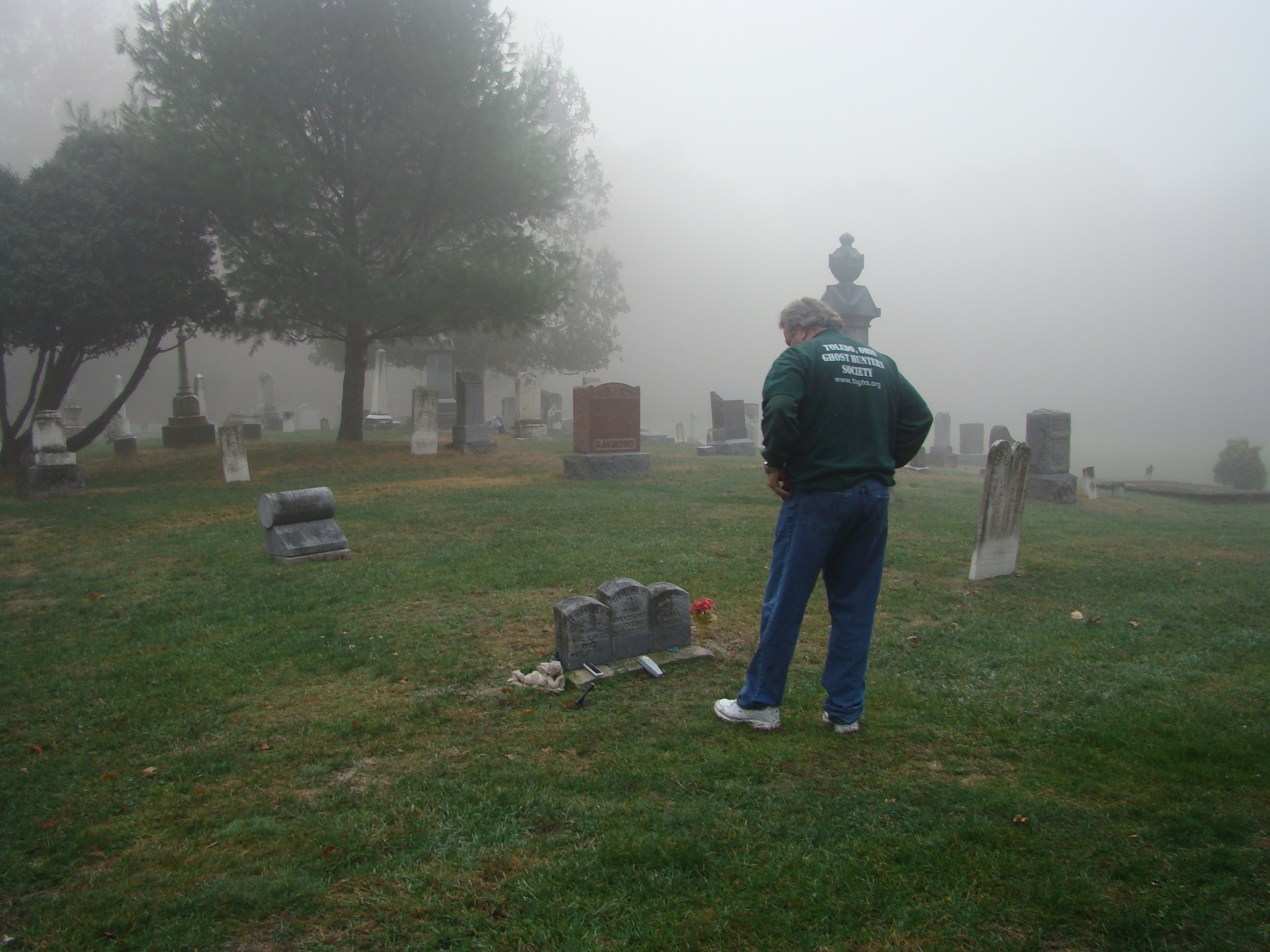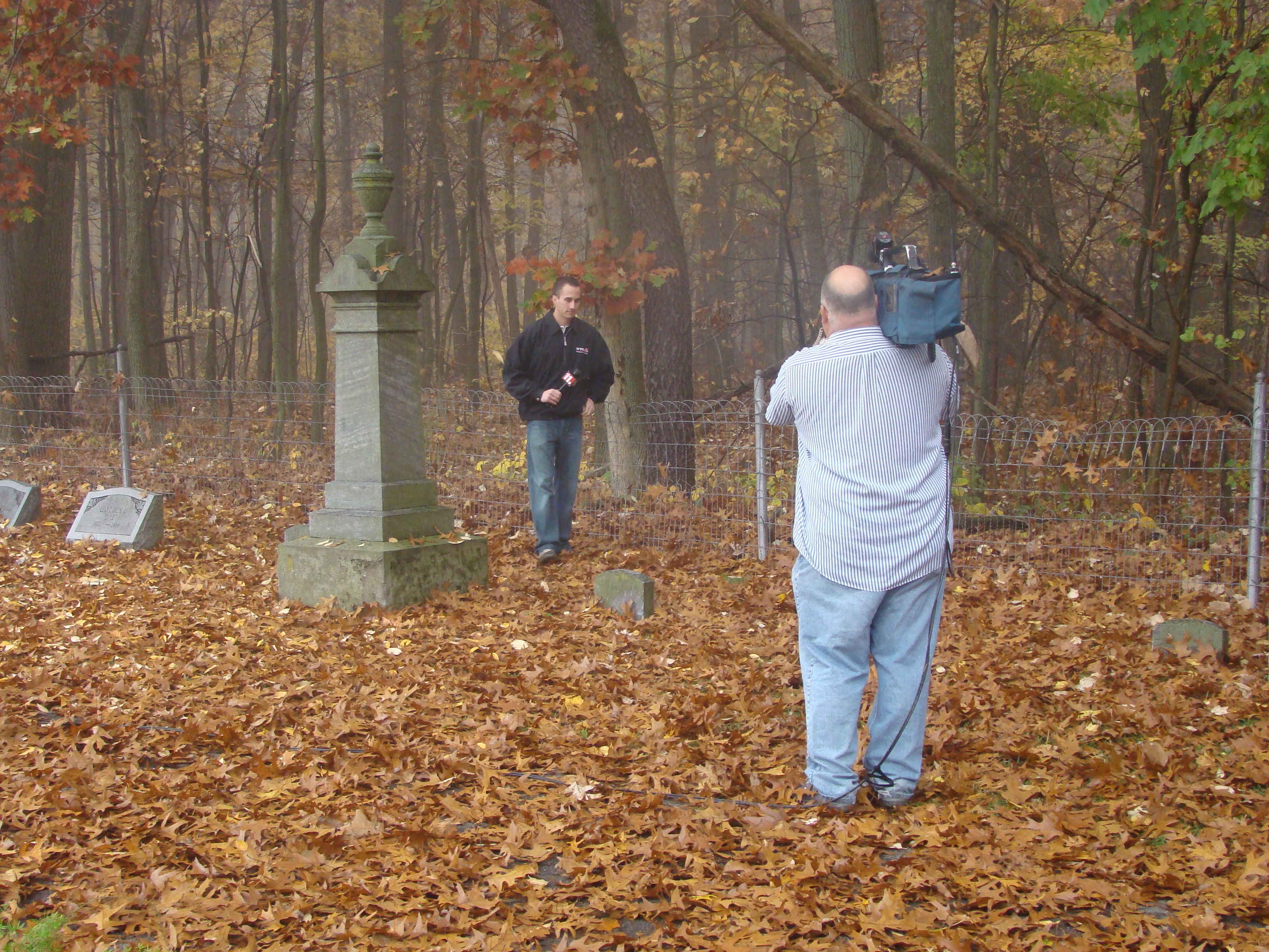 On Wednesday morning we went on the air live at 9:00am from the Lady in the Attic home on Toledo’s Eastside.  Mike, John, Becky and I arrived early at 8:00am to set up equipment. Once on the air, I was interviewed by Chris Vickers while the team worked an EVP session from the Attic, We did not capture anything paranormal but had fun working with WTOL 11 news. After the live broadcast we received tons of emails and blogs to our web site as well as requests for investigations. We kind of knew doing this Halloween telecast would bring out opinions and personal beliefs from our local audience. We agreed to set up another live show for the following morning.  Mike and I met Chris Vickers at one of our favorite legendary Haunted cemeteries, Wolfinger. The morning was very foggy and seemed perfect for an investigation and broadcast. We set up our equipment at two locations within the cemetery, the first set of headstones belonged to the three children that had died within a week of each other in the late 1800’s. Thomas, Rebecca and Ernest have been known to run along the fence line and throughout the cemetery, now they were being video taped and recorded during the entire broadcast as well as our longtime friend Eliza Ford, You might remember her name from one of my earlier investigations to this legendary haunted hot spot.  We shared air time between both locations but neither Eliza nor the children felt like being seen live on television during the broadcast.  I’ve included several pictures from Wolfinger cemetery that were taken during the broadcast. TOGHS would like to thank Rebecca Gilles, Chris Vickers and the entire staff at WTOL Toledo 11 news.
